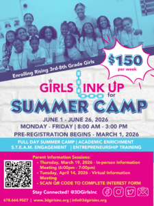 The Girls Link Up summer program targets rising 3rd-8th grade girls across Atlanta. Sessions will occur Monday – Friday from 8:00am – 3:30pm starting June 1, 2026 through June 26, 2026. Each day of the week is scheduled to incorporate elements of STEAM and Entrepreneurship. Academic sessions occur during morning sessions, specifically focusing on improving math fluency and building reading skills using science in a contextual learning framework. We are intentional about providing an affordable, one-of-a-kind summer experience for girls to explore, engage and ignite their passions.
